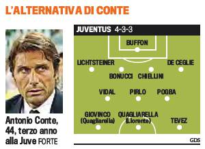 JUVENTUS CONTE MODULO – Antonio Conte si è sempre lamentato del fatto di non poter puntare sul 4-3-3 come modulo di gioco della Juventus. La mancanza di un esterno di ruolo potrebbe complicare i piani ma la Gazzetta dello Sport, analizzando la rosa bianconera, ha mostrato un 11 importante per poter fare il 4-3-3. In difesa giocherebbero Chiellini e Bonucci centrali, con Lichtsteiner a destra e De Ceglie a sinistra, a centrocampo Vidal, Pirlo e Pogba, mentre in attacco Tevez e Giovinco larghi con Quagliarella o Llorente al centro. Conte potrebbe pensare a questo tipo di formazione. Ecco la foto.
