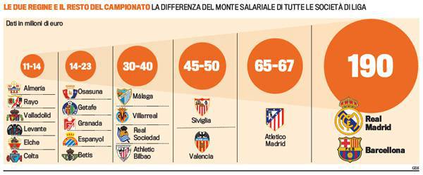 pubblica la classifica del tetto salariale delle 20 squadre del campionato spagnolo, e le differenze sono evidenti: Real e Barca possono arrivare quasi a 200 milioni di euro, Almeria, Rayo Vallecano, Valladolid, Levante, Elche e Celta devono fermarsi a una quota compresa tra 11 e 14 milioni. Osasuna,