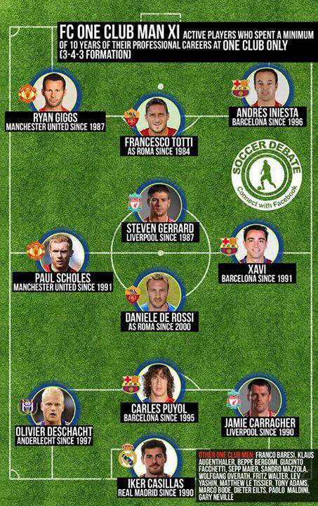 FOTO TOP 11 TOTTI GIGGS INIESTA CASILLAS – La notizia del prolungamento per altri due anni del contratto di Francesco Totti con la Roma, ha posto al centro dell’attenzione l’importanza di avere una “bandiera” all’interno della squadra. Giggs, Iniesta, Scholes, Casillas, Carragher e Puyol: sono davvero tanti i calciatori, rimasti fedeli alla maglia per tantissimi anni, senza mai preferire l’approdo in altri lidi. Merce rara nel calcio di oggi le bandiere… In questa formazione, sarebbe potuto essere presente anche Alessandro Del Piero, se la Juventus non avesse deciso nel 2012 di interrompere il rapporto quasi ventennale con l’allora capitano e numero dieci… Abbandoniamo le polemiche e tuffiamoci invece in questa fenomenale formazione, che rappresenta il meglio del calcio mondiale, realizzata da Soccer Debate.
