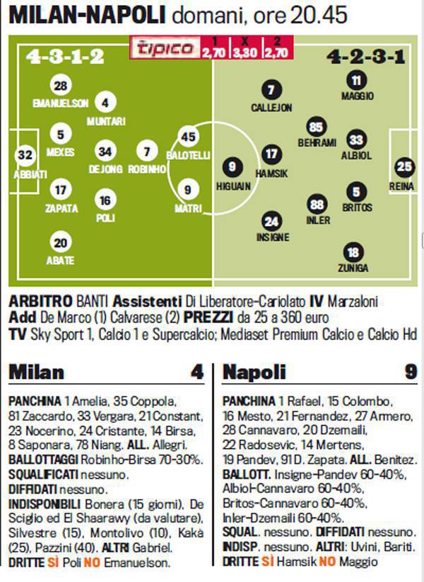 MILAN NAPOLI FORMAZIONI SERIE A- Nella quarta giornata della Serie A, Milan e Napoli, rispettivamente a 4 e 9 punti in classifica, si sfidano domani alle ore 20.45 allo stadio San Siro di Milano. In casa rossonera, stando a quanto riporta la Gazzetta dello Sport, Max Allegri sta riflettendo se schierare Birsa o il brasiliano Robinho. Partiranno invece dalla panchina Kevin Constant, Cristian Zaccardo e Antonio Nocerino, ai quali vengono preferiti Emanuelson, Abate e Poli. Tutti a disposizione invece per Rafa Benitez, che schiererà Insigne, Hamsik e Callejon dietro a Higuain in attacco. In difesa Albiol e Britos sono in vantaggio nel ballottaggio con Cannavaro, mentre a centrocampo Inler e Behrami verranno preferiti a Dzemaili.