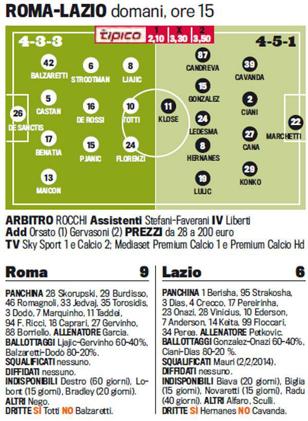 ROMA LAZIO PROBABILI FORMAZIONI GARCIA GERVINHO HERNANES – Domenica alle ore 15 ci sarà il grande derby romano tra Roma e Lazio. Un match sicuramente molto sentito dai giallorossi che vogliono vendicare la sconfitta nella finale di Coppa Italia del 26 maggio. Nella Roma in attacco spazio a Gervinho, esterno ivoriano che prenderà il posto di Ljajic che potrebbe non essere del match. Nella Lazio invece ritorna in campo Hernanes, fuoriclasse brasiliano. Giocherà a centrocampo nella linea dei cinque. In attacco il solo Klose. Ecco le probabili formazioni secondo la Gazzetta dello Sport.