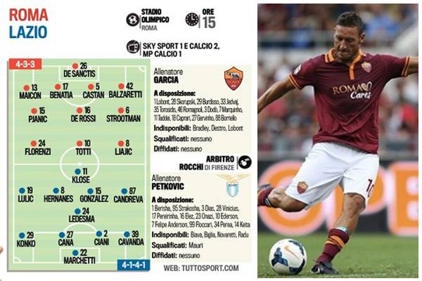 ROMA LAZIO PROBABILI FORMAZIONI – L’attesa è finita. Dopo quattro mesi dalla finale di Coppa Italia, la Roma ha l’occasione di prendersi la sua rivincita. I giallorossi di Rudi Garcia, contro ogni pronostico, arrivano meglio al derby con nove punti in classifica e il morale alle stelle. Il derby, però, si sa è una partita dal risultato imprevedibili. Garcia può contare su tutti gli uomini, con esclusione di Destro e Bradley. I giallorossi scenderanno in campo con il 4-3-3 con De Sanctis in porta; Maicon, Benatia, Castan, Balzaretti in difesa; Pjanic, De Rossi, Strootman a centrocampo; Florenzi, Totti, Ljajic in attacco. Petkovic risponde con il 4-1-4-1 con Marchetti in porta; Konko, Cana, Ciani, Cavanda in difesa; Lulic, Hernanes, Gonzalez, Candreva a centrocampo; Ledesma sulla trequarti e Klose in attacco.