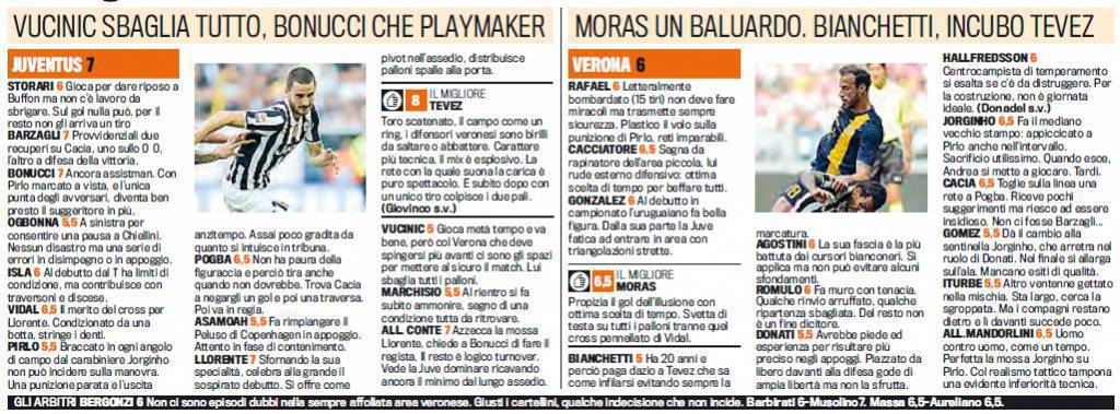 JUVENTUS HELLAS VERONA VOTI PAGELLE GAZZETTA DELLO SPORT – In questa pagina troverete i voti e le pagelle Gazzetta dello Sport di Juventus-Hellas Verona, gara giocatasi ieri pomeriggio alle ore 15.00 allo stadio Juventus Stadium di Torino e conclusasi con il risultato di 2 a 1 in favore dei bianconeri. Migliore in assoluto è Carlitos Tevez, voto 8 per lui, che la Gazzetta dello Sport definisce un toro scatenato. Bene anche Llorente, al primo gol in bianconero mentre malino Pirlo (voto 5.5), sostituito ieri attorno al 65esimo del match con annesso broncio del bresciano.