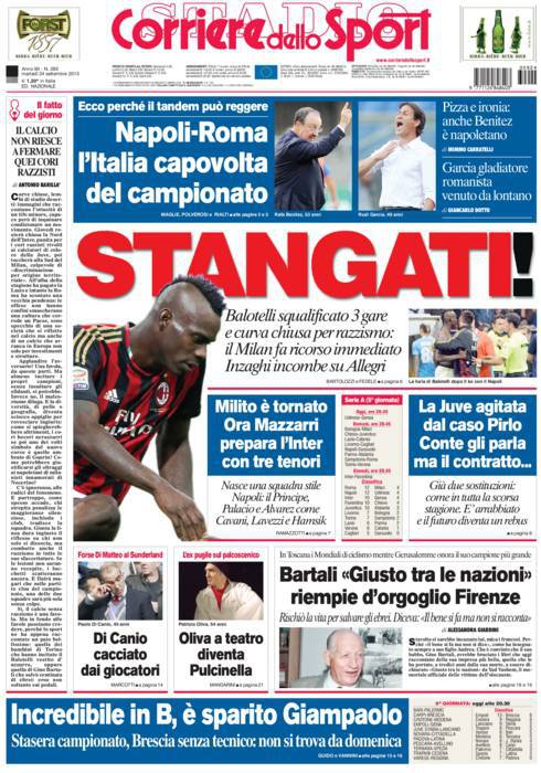 CORRIERE MILAN – Balotelli fermato tre giornate, chiusa la curva del Milan per insulti territoriali.