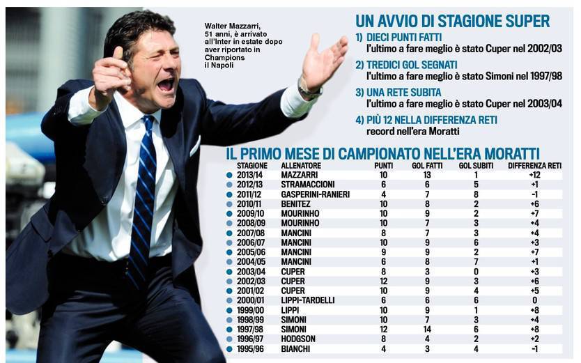 FOTO INTER MAZZARRI PARTENZA – Uno scatto in partenza così, forse non se lo aspettavano neanche in casa Inter: Walter Mazzarri, tecnico arrivato in estate dal Napoli, ha compiuto un vero e proprio miracolo, rivoltando come un calzino la sua Inter e portandola ad essere imbattuta in queste prime 4 giornate di campionato. Manca il record per pochissimo il livornese ex Samp, visti i 10 punti, 13 gol fatti, 1 gol subito ed una differenza reti di +12. Cifre da capogiro che fanno sognare i tifosi della squadra nerazzurri, rinfrancati dall’arrivo di Mazzarri, dopo un’annata disastrosa a dir poco. Ed adesso nessun freno per l’Inter…