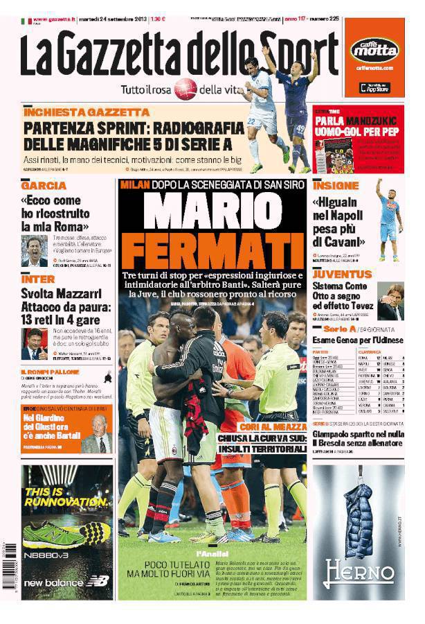 GAZZETTA BALOTELLI – Sulla Gazzetta dello Sport si parla di Balotelli che è stato squalificato per tre giornate dal Giudice Sportivo.