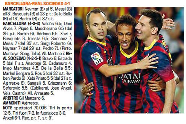 BARCELLONA REAL SOCIEDAD VOTI PAGELLE GAZZETTA FOTO – Il Barcellona vince quattro a uno contro la Real Sociedad e vola in classifica. I blaugrana di Martino continua a vincere e convincere, soprattutto con azioni spettacolari. In gol per la prima volta nella Liga Neymar, calciatore brasiliano prelevato dal Santos. Il secondo gol è di Messi, campione argentino. Mentre la terza rete è di Busquets, la Real Sociedad segna con De La Bella. Il quarto gol del Barcellona lo ha segnato il difensore Bartra. Al Barcellona di Martino segnano davvero tutti. Ecco i voti.