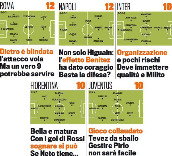 FOTO BIG 5 CAMPIONATO CONFRONTO ROMA NAPOLI INTER FIORENTINA JUVENTUS – Le prime giornate del campionato di Serie A hanno dettato la supremazia di 5 squadre su tutte: la sorprendente Roma, grazie alla cura portata avanti dal nuovo tecnico Rudi Garcia, il Napoli di Rafa Benitez e Gonzalo Higuain, l’Inter di Walter Mazzarri, la Fiorentina di Vincenzo Montella e la Juventus di Antonio Conte. La Gazzetta dello Sport stamani ha realizzato un confronto tra le squadre al momento in testa alla classifica del campionato di Serie A. Un confronto tra le “5 sorelle”: chi la spunterà a maggio, quando il campionato sarà concluso?