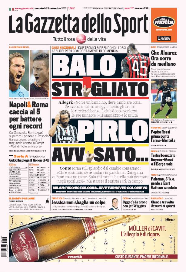 GAZZETTA BALOTELLI PIRLO – Sulla Gazzetta dello Sport si parla di Balotelli che viene bacchettato e multato dal Milan e da Pirlo che viene avvisato da Conte.