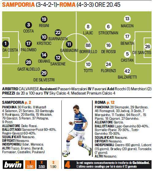 SAMPDORIA ROMA PROBABILI FORMAZIONI DELIO ROSSI MODULO GARCIA BORRIELLO – La Sampdoria di Delio Rossi dovrà cercare di vincere il match contro la Roma per ritrovare un po’ di serenità. La Roma però viaggia a mille è a punteggio pieno, per questo Rudi Garcia vuole continuare in questo modo. Nella Roma possibile turnover, in attacco pronto Borriello con Totti sulla sinistra e Ljajic sulla destra. A centrocampo Florenzi al posto di Pjanic. Nella Sampdoria invece previsto un cambio modulo con la difesa a tre, centrocampo a quattro e due dietro l’unica punta Gabbiadini. Probabili formazioni secondo la Gazzetta dello Sport.