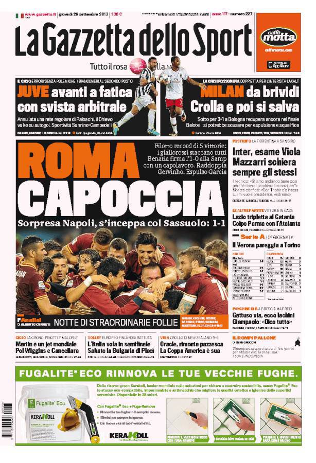 GAZZETTA ROMA – Sulla Gazzetta dello Sport si parla della Roma che vincendo due a zero a Roma si porta in testa alla classifica con cinque vittorie su cinque.