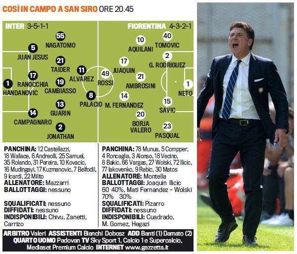 INTER FIORENTINA PROBABILI FORMAZIONI MAZZARRI MONTELLA ROSSI – Questa sera alle ore 20.45 allo stadio Meazza di San Siro, Inter e Fiorentina si affronteranno nel posticipo della quinta giornata di campionato. I nerazzurri cercheranno di vincere la quarta partita su cinque di questo campionato cercando di trovare la soluzione giusta per perforare la difesa della Fiorentina di Montella. Fiorentina che non avrà ovviamente Gomez in attacco ma ci sarà Giuseppe Rossi con Mati Fernandez e Joaquin a supporto. Nell’Inter invece tutto confermato, ci saranno in campo i soliti undici. Ecco le probabili formazioni secondo la Gazzetta dello Sport.