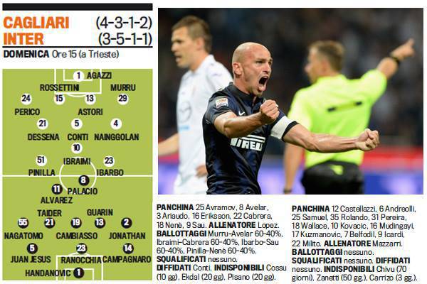 CAGLIARI INTER GUARIN KOVACIC MAZZARRI IBRAHIMI – Walter Mazzarri ieri al termine del match contro la Fiorentina ha dichiarato che nella trasferta di Cagliari giocherà Kovacic dal primo minuto. Al posto di chi? L’indiziato numero uno potrebbe essere Fredy Guarin, centrocampista colombiano che ha polemizzato con il pubblico di San Siro. Per il resto formazione confermata per l’Inter. Nel Cagliari tridente con il macedone Ibrahimi trequartista dietro a Pinilla e Ibarbo. Si giocherà domenica alle ore 15 allo stadio di Trieste. Ecco le probabili formazioni secondo la Gazzetta dello Sport.