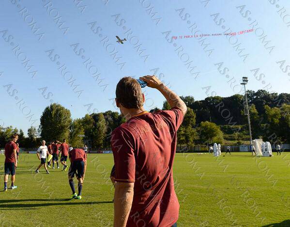 ROMA TOTTI AUGURI COMPLEANNO AEREO – Tanti i messaggi di stima ed affetto giunti a Francesco Totti nel giorno del suo trentasettesimo compleanno. Il più speciale fra tutti, però, è stato recapitato al capitano della Roma tramite un aereo che questo pomeriggio ha sorvolato Trigoria con uno striscione: “Per te parla la storia. Auguri immenso capitano“. Anche da parte di fan inglesi sono arrivati auguri per l’attaccante giallorosso: “Amo accannato sua maestà pe venitte a festeggià. Venimo da lontano, auguri Capitano“. Al centro sportivo Fulvio Bernardini è comparso anche il messaggio che ieri era stato attaccato vicino al Colosseo: “Roma 27.9.1976 ore 13.20: l’inizio di una leggenda. Tanti auguri Capitano“.