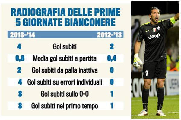 JUVENTUS DIFESA – La Juventus di Antonio Conte sembra aver perso l’amuleto magico degli ultimi anni e guardando i numeri non è più l macchina invincibile che ha vinto lo scudetto negli ultimi due anni. Nelle prime cinque giornate, la squadra bianconera ha subito 4 gol in cospetto ai 2 dello scorso anno: ha una media di gol subiti a partita di 0.8. Due gol sono arrivati da palla inattiva mentre 4 da errori individuali. Rispetto allo scorso anno, inoltre, i bianconeri subiscono più spesso per primo il gol: i numeri, infatti, dicono 3-1 così come sono tre i gol subiti nel primo tempo rispetto ad una sola rete nello scorso anno.