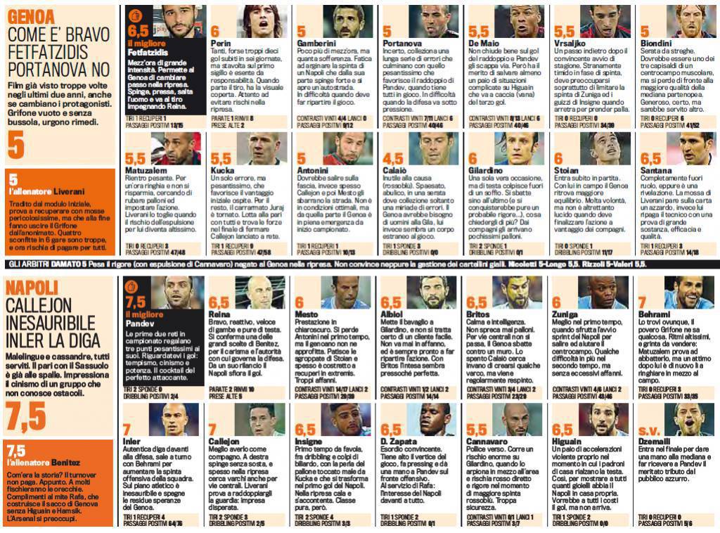 GENOA NAPOLI VOTI PAGELLE GAZZETTA DELLO SPORT – Eccovi i voti e le pagelle Gazzetta dello Sport di Genoa-Napoli, gara giocatasi ieri sera allo stadio Marassi di Genova e conclusasi con il risultato di 2 a 0 in favore dei partenopei. Migliore in campo è Goran Pandev, autore di una splendida doppietta, e serio candidato per una maglia da titolare nella sfida di Champions League contro l’Arsenal. Molto bene anche il solito Callejon, ormai una conferma, così come Valon Behrami, leader di centrocampo.