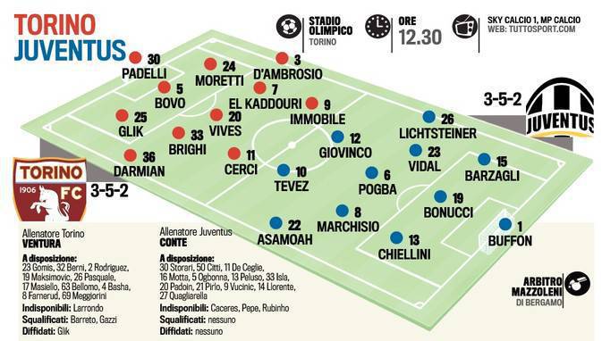 TORINO JUVENTUS PROBABILI FORMAZIONI – L’attesa per il derby della Mole è finita. Alle 12.30, allo stadio Olimpico, andrà in scena la grande sfida tra il Torino e la Juventus. Una sfida dal risultato imprevedibile visto che i granata stanno impressionando per continuità di risultati mentre la Juventus, pur essendo al secondo posto in classifica, sta dimostrando di avere qualche problema in più rispetto agli anni scorsi. Giampiero Ventura schiererà il Toro con il 3-5-2 con Padelli in porta, Glik, Bovo e Moretti in difesa; Darmian, Brighi, Vives, El Kaddouri e D’Ambrosio a centrocampo; Cerci e Immobile in attacco. Antonio Conte risponde con il 3-5-2 con Buffon tra i pali; Chiellini, Bonucci, Barzagli in difesa; Asamoah, Marchisio, Pogba, Vidal e Lichsteiner a centrocampo; Tevez e Giovinco in attacco.