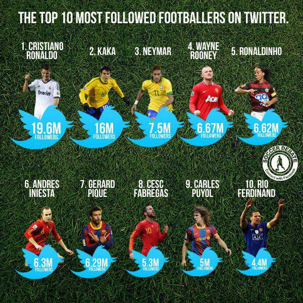 TOP TEN TWITTER – Da un po’ di tempo a questa parte, i social network hanno aumentato il proprio peso nella vita di ognuno di noi e così anche in quella dei calciatori. Uno su tutti Twitter, con milioni di utenti che non aspettano altro che il proprio idolo scriva qualcosa o che pubblichi una sua foto. Ma chi è il calciatore che vanta il maggior numero di follower? La risposta è Cristiano Ronaldo, con oltre 21 milioni di fan. L’asso portoghese è seguito dall’unico calciatore di Serie A presente in questa speciale classifica: Ricardo Kakà, con quasi 17 milioni di follower.