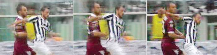 TORINO JUVENTUS MEGGIORINI PROVA TV MARCHISIO FOTO – Nell’accesissimo derby tra Torino e Juventus c’è stato spazio a tante polemiche, in particolare per quelle che riguardano falli da dietro (Immobile su Tevez) e gol irregolari (quello della Juventus viziato dal fuorigioco di Tevez). Torino-Juventus non ha offerto un grande spettacolo ai tifosi, anzi. C’è stato anche spazio per un pugno rifilato da Meggiorini alla schiena di Marchisio, come dimostrano alcune immagini Sky. Per l’attaccante del Torino possibile prova Tv, il gesto non è stato visto da Mazzoleni. Ecco la foto presa dalla Gazzetta dello Sport.