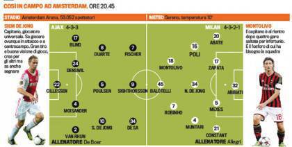 AJAX MILAN FORMAZIONI – Tra poco meno di due ore il Milan scenderà in campo ad Amsterdam per il secondo match della Champions League contro l’Ajax. Per l’occasione, Massimiliano Allegri ritrova Mario Balotelli che non vede l’ora di farsi perdonare dopo la squalifica rimediata in campionato. Per la sfida europea, Massimiliano Allegri ha cambiato l’11 titolare che scenderà in campo. Il tecnico rossonero, infatti, starebbe pensando di lasciare in panchina Birsa, l’uomo della vittoria contro la Sampdoria, per lasciare spazio a Riccardo Montolivo. L’ex Fiorentina agirà quindi sulla trequarti e al posto di quest’ultimo dentro Poli sull’interno di destra. Ancora da capire, invece, il modulo con il quale il Milan scenderà in campo.