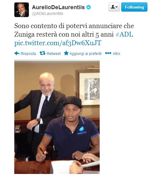 CALCIOMERCATO NAPOLI – Ora è ufficiale, Zuniga ha rinnovato il proprio contratto di 5 anni. Lo ha annunciato poco fa De Laurentiis, con tanto di foto celebrativa, sul proprio profilo Twitter. Si conclude così una delle telenovele più lunghe di mercato dell’estate.