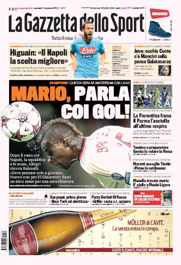 GAZZETTA BALOTELLI – Sulla Gazzetta dello Sport si parla di Balotelli che dovrà segnare per il Milan contro l’Ajax.