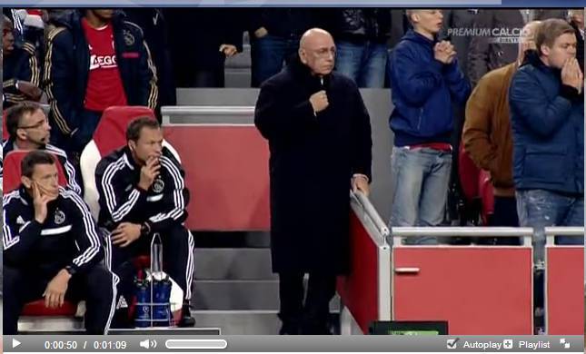 AJAX MILAN BALOTELLI GALLIANI VIDEO – Momenti concitati in Ajax-Milan soprattutto nella parte finale. Prima i Lancieri segnano su calcio d’angolo, era il minuto 90. Il Milan però pareggia al 94esimo minuto con un calcio di rigore di Mario Balotelli, attaccante italiano che con freddezza batte il portiere dell’Ajax e zittisce l’Amsterdam Arena. La scena divertente però è quella di Galliani che prima del rigore di Balotelli scende dalla tribuna fino ad arrivare in panchina. Quando vede il gol Galliani si trova accanto alla panchina dell’Ajax e quindi non ha potuto festeggiare come suo solito. Ecco la scena ripresa da Mediaset.