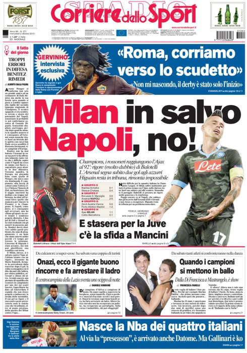 CORRIERE MILAN NAPOLI – Il Corriere dello Sport parla del pareggio del Milan ma anche della sconfitta del Napoli a Londra contro l’Arsenal.