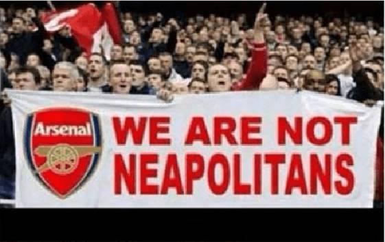 TIFOSI ARSENAL OFFENDONO NAPOLI – Serata amara per il Napoli e i suoi tifosi all’Emirates Stadium di Londra dove, ieri sera, per la seconda giornata dei gironi di Champions, la squadra di Benitez è stata sconfitta per 2-0 dalla squadra di Wenger. A rendere ancora più difficile la serata è stato uno strisicone esposto dai tifosi inglesi che diceva “We are not neapolitans“ ossia “noi non siamo napoletani”. Lo striscione ha già fatto il giro del web riproponendo il problema del razzismo. I tifosi napoletani, infatti, non hanno preso bene lo sfottò inglese ma per altri si tratta di una semplice goliardata. Arriverà anche per l’Arsenal la squalifica?