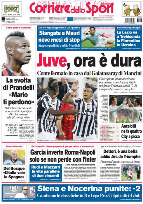 CORRIERE JUVENTUS – Sul Corriere dello Sport si parla della Juventus che viene fermata in casa dal Galatasaray. Secondo pareggio consecutivo in Champions League.
