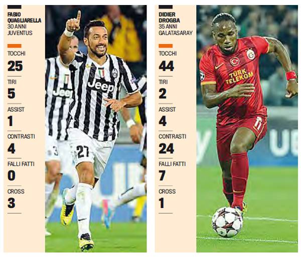 JUVENTUS GALATASARAY QUAGLIARELLA DRGOBA – Ieri il pareggio tra Juventus e Galatasaray è stato anche quello tra Fabio Quagliarella e Didier Drogba, due giocatori importanti. Il primo è entrato al posto di Vucinic infortunato e ha procurato il rigore dell’uno a uno segnato da Vidal e ha poi segnato di testa su cross di Andrea Pirlo. Quagliarella è un calciatore molto importante per Conte, ogni volta che è entrato in campo ha segnato. Nel Gala invece è Drogba l’ago della bilancia, segna il gol dell’uno a zero e propizia quello del due a due svettando sui difensori bianconeri e fornendo l’assist a Bulut. La Gazzetta dello Sport ha proposto la sfida tra i due in cifre.