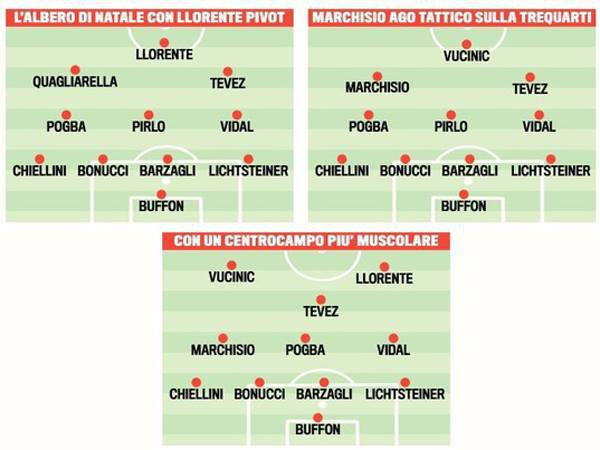 FOTO – Nelle ultime partite la Juventus non è parsa tonica e brillante come da sempre ci ha abituato la squadra di Conte. I bianconeri sono sembrati stanchi e senza idee. Ecco che, per non essere colti di sorpresa dal corso degli eventi, la Vecchia Signora potrebbe scegliere di cambiare pelle. In foto ci sono tre possibili varianti per la Juventus del futuro più imminente. Ci sono due 4-3-3: uno con il centrocampo più muscolare (Pogba, Marchisio, Vidal) con Tevez dietro Llorente e Vucinic, mentre l’altro si basa tutto o quasi sul delicato ruolo di Marchisio, chiamato a fare da ago tattico. Ultima alternativa è l’albero di Natale con Quagliarella e Tevez al supporto dell’unica punta Llorente.