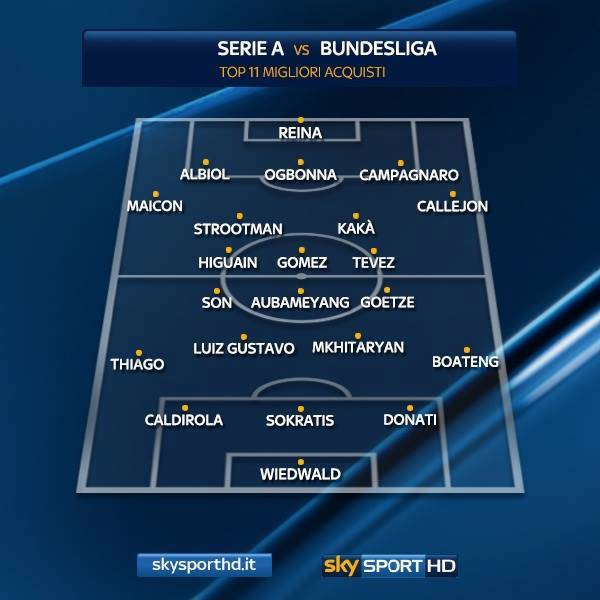 FOTO TOP 11 SERIE A BUNDESLIGA – Quest’estate ha regalato un numero discreto di campioni alla nostra Serie A. Il campionato italiano è davvero lontano anni luce dai migliori europei? Sul piano burocratico-organizzativo non ci sono dubbi: sì, anche tanto. Dal punto di vista dei giocatori però…la sfida è aperta e la foto tratta da Sky lo dimostra. Ecco la migliore formazione fatta con i più forti giocatori arrivati in questo calciomercato in Serie A contro quella dei relativi rinforzi della Bundesliga. Da noi spiccano in primis Mario Gomez, Higuain, Kakà e Tevez, senza scordarci delle rivelazioni Callejon e Strootman. In Germania il mercato è stato più costoso: ecco quindi Luiz Gustavo, Thiago Alcantara, Boateng, Mkhitaryan, Goetze e Aubameyang. Quale delle due formazioni è attrezzata meglio?