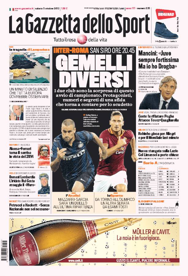 GAZZETTA DELLO SPORT INTER ROMA- Sulla Gazzetta dello Sport di oggi si dà grande spazio alla gara che si giocherà questa sera a San Siro fra Inter e Roma. Vengono paragonate le due squadre, rivelazioni del campionato, attraverso numeri e statistiche. E intanto Roberto Mancini provoca la Juventus: “Sono fortissimi, ma io ho Drogba“.