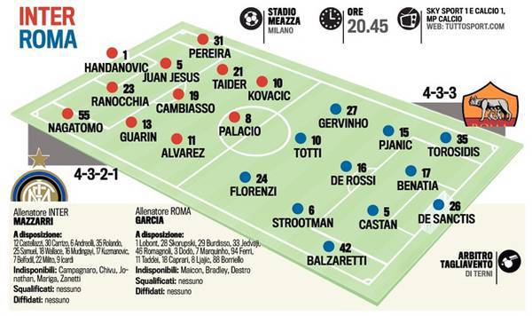 L’Inter risponderà con Handanovic in porta, Nagatomo, Ranocchia, Juan Jesus e Pereira in difesa. A centrocampo, accanto a Cambiasso ci saranno Taider e Guarin. Kovacic e Alvarez giocheranno dietro all’argentino Palacio.