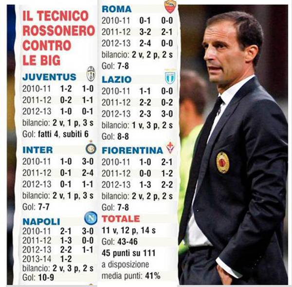 MILAN ALLEGRI SCONTRI DIRETTI- Impressionante, in negativo, i dati relativi alle sfide del Milan di Allegri con le altre big del campionato: nel 2010-2011, la stagione dello scudetto, i rossoneri hanno infatti perso in casa con la Roma (0-1) per pareggiare poi all’Olimpico (0-0 nella partita che assegnò il titolo), con la Juventus persero 2-1 all’andata vincendo 1-0 al ritorno, furono fermati dalla Lazio sia all’andata che al ritorno (0-0 e 1-1), vincendo poi però contro l’Inter (1-0 e 3-0) Fiorentina (1-0 e 2-1) e Napoli (2-1 e 3-0). Nell’anno successivo il Milan ha invece conquistato 6 punti con la Roma, due soli nelle sei gare giocate con Juve, Lazio e Inter, ottenendo appena due punti (in totale) contro Napoli e Fiorentina. L’anno scorso invece Allegri ha conquistato 1 punto con la Roma, 1 punto con la Juve, 3 con la Lazio, 1 con l’Inter, 1 con la Fiorentina e 2 col Napoli, con cui ha perso anche in questa stagione.
