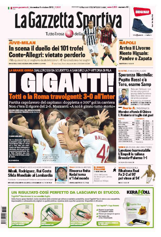 RASSEGNA STAMPA GAZZETTA DELLO SPORT – La Gazzetta dello Sport celebra la Roma capace di imporsi per 3-0 contro l’Inter. La rosea celebra soprattutto la prestazione di Francesco Totti, che ha messo a segno due reti (la prima su calcio di rigore che non c’era) e ha raggiunto così il gol numero 300 in carriera.