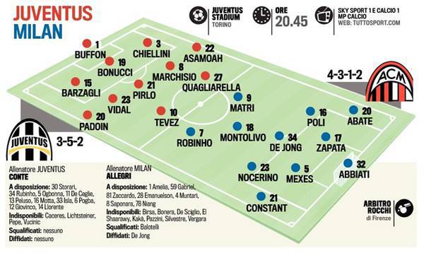 JUVENTUS MILAN PROBABILI FORMAZIONI – Reduci dalle fatiche di Champions League, Juventus e Milan si troveranno l’una di fronte all’altra questa sera. Fischio d’inizio alle 20.45 allo Juventus Stadium per una partita dai tanti contenuti. Secondo Tuttosport, per la Juve, oltre ai sempre titolari Buffon, Barzagli Bonucci e Chiellini, dovrebbero essere Padoin, Vidal, Pirlo, Marchisio e Asamoah i cinque di centrocampo, con Pogba in panchina. A fare in coppia con Tevez sarà invece Quagliarella. Dall’altra parte Allegri dovrebbe schierare Abate, Zapata, Mexes e Constant davanti ad Abbiati. La mediana sarà composta da Poli, De Jong e Muntari. Come trequartista agirà Montolivo alle spalle di Robinho e Matri, alla prima contro i bianconeri da ex.