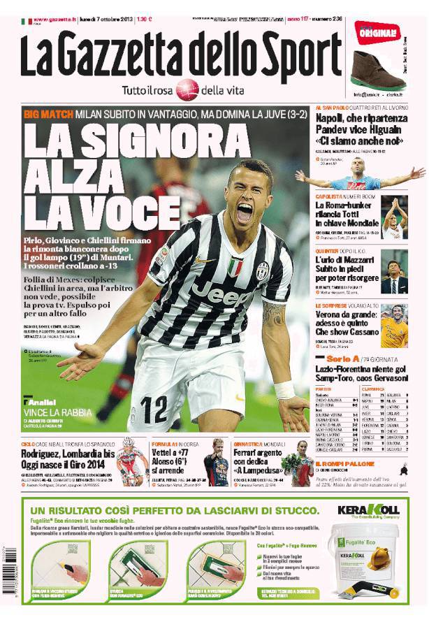 GAZZETTA JUVENTUS – La Juventus vince tre a due contro il Milan e continua a inseguire la Roma. Milan a -13 dalla vetta.