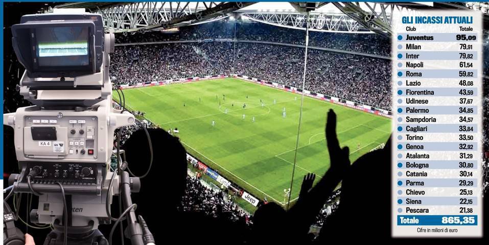 INCASSI TV – Gli incassi tv riescono a garantire una discreta cifra ai club della nostra Serie A e B. In totale ballano sul piatto 865, 35 milioni di euro. E allora dove sta il problema? Nella distribuzione di questi soldi! Se osserviamo la foto riusciamo a vedere quanto evidente sia il dislivello che sussiste fra le prime della classe e le altre squadre. La Juventus guida la graduatoria con oltre 90 milioni di euro seguita da Milan, Inter e Napoli. Scendendo sempre più in basso il gruzzolo diminuisce sempre di più fino ad arrivare intorno ai 20 milioni di euro. L’ultima della A, il Chievo, riceve una cifra di circa 21 milioni di euro, praticamente una goccia nell’oceano paragonata alle big.