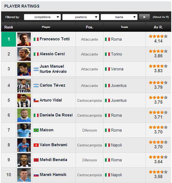 FOTO TOP 10 TOTTI – E’ ancora presto per fare giudizi ma intanto si possono valutare le prime sette giornate di Serie A visto che qualcosa di consistente c’è stato. Come per esempio la rinascita di Totti, capitano giallorosso, oppure il bel momento dei giocatori del Napoli di Benitez. In ogni caso, Goal.com ha stilato la seguente classifica , quella dei migliori top player, come riportata dalla foto. Al primo posto troviamo proprio Totti, seguito da due sorprese: Cerci del Torino e Iturbe del Verona, salito alla ribalta grazie allo splendido gol messo a segno contro il Bologna. Scendendo troviamo poi Tevez e Vidal, duo bianconero che stacca di poco De Rossi e Maicon. A chiudere ecco Hamsik.