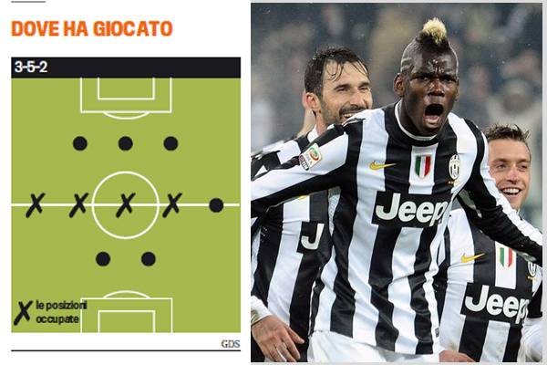 POGBA JOLLY ALA RUOLI – Quando la Juventus due estati fa strappò il giovane Paul Pogba al Manchester United molti addetti ai lavori si complimentarono con Marotta e soci per l’operazione. Ma nessuno si aspettava un Pogba così devastante. Il centrocampista francese infatti si è subito imposto con la sua esuberanza fisica, la sua tecnica. E soprattutto a Conte ha dato modo di poterlo inserire in molti ruoli di gioco. Per esempio da regista al posto di Pirlo, oppure da interno al posto di Marchisio. In certe occasioni ha giocato anche da ala destra nel centrocampo a cinque. Manca solo la fascia sinistra, l’attacco e la difesa. Un giocatore totale. Ecco la foto della Gazzetta dello Sport.