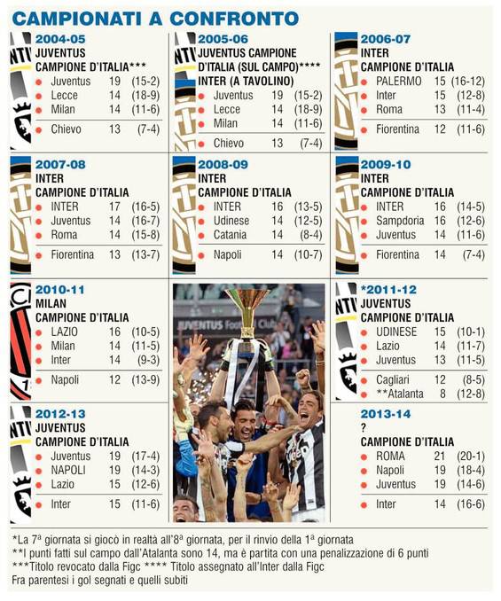 FOTO SERIE A CAMPIONATI CONFRONTO – Grazie alla pausa dei campionati a causa delle gare di qualificazioni delle rappresentative nazionali, ci si può concentrare sulle prime analisi di questo campionato, iniziato già su altissimi ritmi. Lo scatto delle prime non ha lasciato scampo alla squadre costrette ad inseguire il gruppo delle grandi. Analizzando e confrontando le partenze della Serie A dal 2004 al 2005 ad oggi, mai dopo 7 giornate ci si era trovati ad un distacco netto di ben 5 punti tra la 3^ e la 4^ in classifica, come accade invece quest’anno tra Juventus ed Inter. Una situazione che potrebbe fortemente ripercuotersi sulla classifica finale del campionato.
