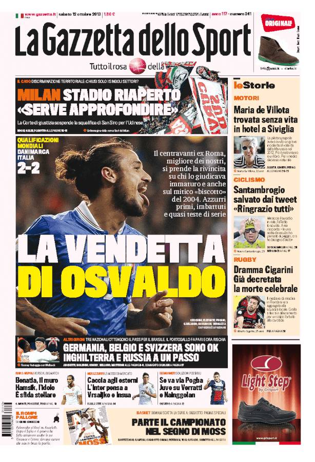 GAZZETTA OSVALDO – Sulla Gazzetta dello Sport si parla del pareggio dell’Italia in Danimarca con un Osvaldo scatenato.
