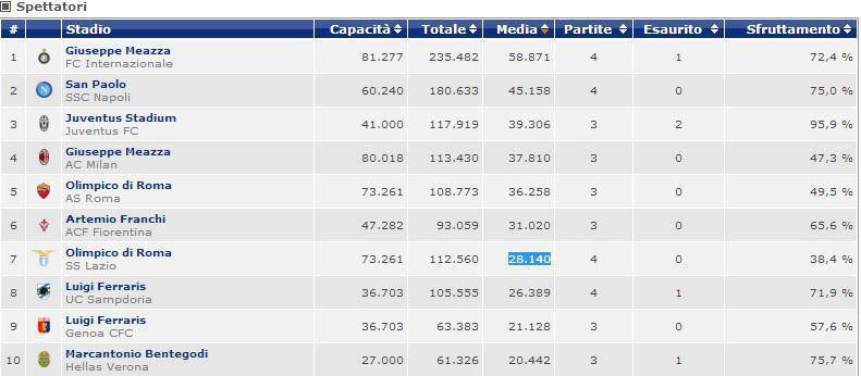 SERIE A STADI – Nonostante siamo solo ad ottobre, la squadra che raccoglie più pubblico è l’Inter che a San Siro con 81.277 spettatori. Al secondo posto c’è il San Paolo di Napoli con 45.158 spettatori. Al terzo posto la Juventus con 39.306 e quarto il Milan con 37.810. Al quinto posto si piazza la Roma, al sesto la Fiorentina, settima la Lazio, ottava la Sampdoria, nono il Genoa e decino l’Hellas Verona. Nonostante gli episodi di razzismo e di violenza, dunque, la Serie A continua ad attirare pubblico. La crisi, dunque, non spaventa i tifosi di tutta Italia che continuano a riempire gli stadi.