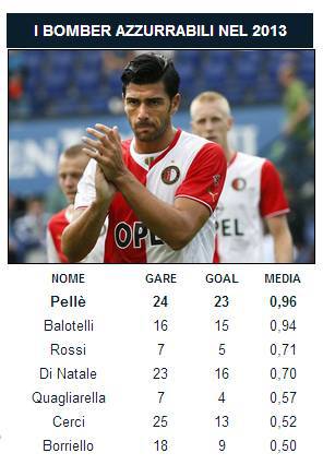 FOTO CLASSIFICA BOMBER ITALIANI 2013 – In un periodo di pausa dai match dei club, come questo, ci si può concentrare su quelle che sono le analisi calcistiche e tecniche, anche in funzione del mondiale 2014. Scorgendo la classifica stilata da Goal.com sui migliori bomber italiani del 2013, salta all’occhio certamente la prima posizione. A vincere non è come tutti ci saremmo aspettati, Mario Balotelli, ma è invece Graziano Pellè, 28 enne attaccante del Feyenoord che sta facendo faville in Olanda. Il calciatore può vantare una media gol vicina al gol a partita, avendo realizzato 23 gol in 24 gare. Il calciatore, fuori dal giro della nazionale dai tempi dell’Under 21, potrebbe essere così chiamato da Cesare Prandelli nei prossimi impegni pre mondiale.