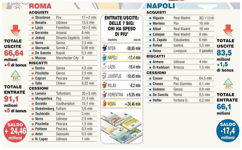 FOTO ROMA NAPOLI INCASSA SPENDE – Si incontreranno venerdì sera all’Olimpico di Roma, Roma e Napoli, squadre che ricoprono le posizioni più nobili della classifica della Serie A. Sarà una gara spettacolare tra due delle squadre che stanno esprimendo il miglior calcio in Italia, sebbene abbiano agito sul mercato in maniera sostanzialmente differente. Le entrate della Roma, principalmente riportate dalle cessioni di Lamela, Marquinhos ed Osvaldo, sono state parzialmente reinvestite; l’incasso dalla cessione di Edinson Cavani invece, in casa Napoli, è stato prontamente immesso sul mercato, come svela l’interessante grafica del Corriere dello Sport qui in alto. E sul campo, come andrà a finire tra Roma e Napoli?