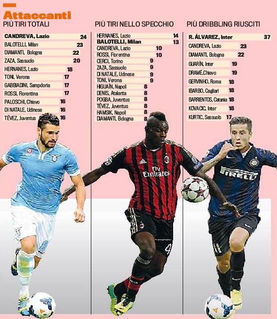 FOTO SERIE A ATTACCANTI CAMPIONATO DRIBBLING – La pausa del campionato di Serie A per gli impegni delle rappresentative nazionali, regala un momento di calma per poter iniziare le prime analisi su questo inizio di stagione. La Gazzetta dello Sport, ha realizzato una serie di specchietti con delle interessanti statistiche sul massimo campionato nostrano. Ci concentriamo, in questa fase, sugli attaccanti, messi in ordine per tiri totali, tiri nello specchio e dribbling riusciti. A comandare le classifiche sono rispettivamente Antonio Candreva della Lazio, il brasiliano Hernanes della Lazio e Ricky Alvarez dell’Inter. Dati importanti che fanno comprendere anche i diversi stili di gioco delle diverse squadre.
