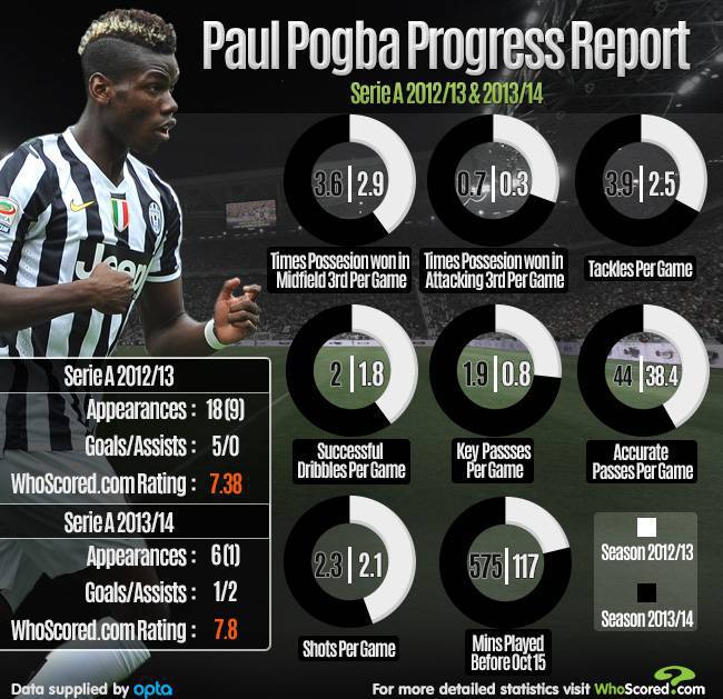 FOTO JUVENTUS PAUL POGBA – E’ una crescita davvero esponenziale quella di Paul Pogba, centrocampista francese della Juventus, che sta pian piano diventando uno dei calciatori più forti del globo. I meriti sono soprattutto suoi: dedizione, impegno negli allenamenti ed un gran talento, sono gli ingredienti base per la costruzione di un fenomeno. Ed ovviamente, di Antonio Conte, tecnico bravo ad insistere sul centrocampista transalpino. I risultati della “cura Conte” sono assolutamente evidenti: in una stagione, Pogba si è tramutato in un grandioso centrocampista, capace di ricoprire diversi ruoli. WhoScored.com ha messo in luce, con una bellissima grafica che evidenzia i miglioramenti del numero 6 bianconero.