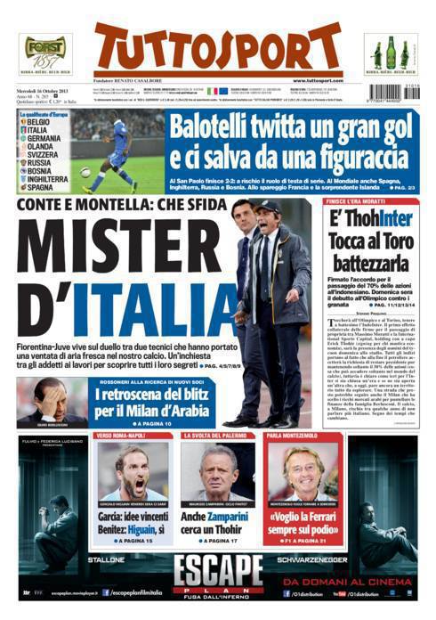 TUTTOSPORT CONTE MONTELLA – La sfida tra Fiorentina e Juventus è anche quella tra Montella e Conte. Una super sfida tra tecnici.